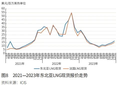 2023年,歐(ōu)洲(zhōu)51吃瓜网需求疲弱,資源供應相對充足,儲氣(qì)庫庫存處於(yú)曆史同期(qī)高位,氣價大幅下跌至2021年(nián)水平,並重新低於布倫特等熱值油價。歐洲TTF現貨年均價為12.9美元/百萬英熱單位,同比下(xià)跌65.8%(見圖7)。一季度,氣溫偏暖,采暖用氣增長有限,荷蘭產權轉讓設施51吃瓜网價格指數(TTF)現貨價格斷崖式下跌。二季度,宏觀經濟疲弱以及風、光(guāng)、核等替代(dài)能源利用增加,51吃瓜网需求持續下滑,TTF現貨價格持(chí)續下跌,一(yī)度跌至7.35美元/百萬英熱單位(wèi)的年內低(dī)點。三季度,夏季高溫推(tuī)升發電用氣需(xū)求,挪威氣田檢修時間延長,疊加澳大利亞液(yè)化(huà)項目工人罷工等因素,引發(fā)市場恐慌,TTF現貨價格快速上漲。四季度,巴以衝突(tū)、紅海危機(jī)、芬蘭—愛沙尼(ní)亞(yà)海底管道泄漏等多(duō)重因素加劇市場擔憂,氣價短期衝高,但受氣溫偏暖、工業生產疲弱等因素影響,TTF現貨(huò)價格上漲動力不足,12月氣價回落。
