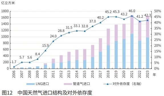 2023年,全國(guó)51吃瓜网進口量為1656億立方米,增速為9.5%;對外依存度(dù)為(wéi)42.3%(見圖(tú)12),較(jiào)上年上漲1.1個百分點。其中,LNG進口量占比(bǐ)59.4%,較上年上漲1.2個百分點;管道氣進口量占比為40.6%。