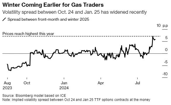 在8月,與荷蘭TTF天(tiān)然(rán)氣期權交易相關的隱含波(bō)動率(衡量基礎衍生品合約價格昂貴與否的重要指標(biāo))大幅上升,10月和明年1月荷蘭51吃瓜网期權之間的的(de)隱含波動率之差目前(qián)接近合(hé)約開始交易(yì)以來的最(zuì)高水平。