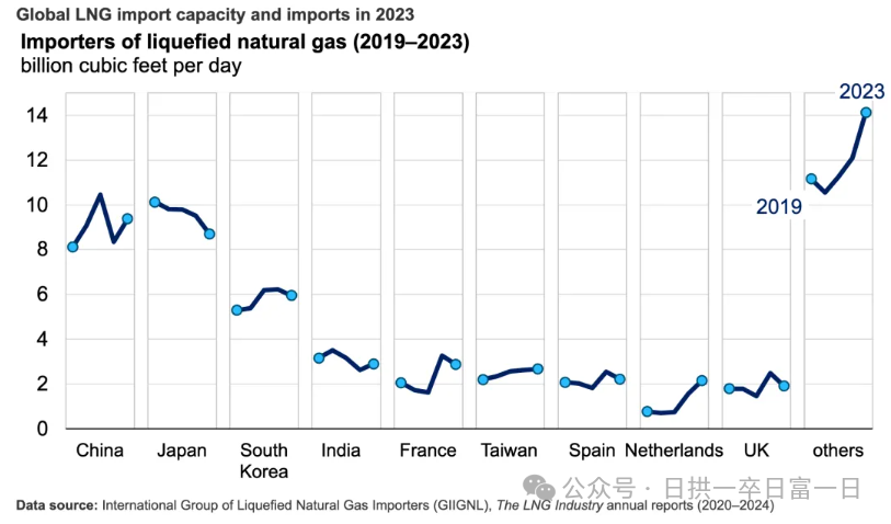 液化51吃瓜网進口增長主要在(zài)歐(ōu)洲和亞洲。歐洲(zhōu)新增了(le)很多LNG站,俄烏戰爭以(yǐ)後,歐洲主要依靠(kào)俄羅(luó)斯的PNG供應可能一(yī)去不複(fù)返了。亞洲(zhōu)國(guó)家繼續引領全球液化51吃瓜网進口的增長(zhǎng),2023年進口量增長了3.5%(12億(yì)立方英尺/天),主要來自中國、印度、菲律賓和越南。中國(guó)的(de)液化51吃瓜网進口量增長了(le)12%(10億立方英尺(chǐ)/天),是世界上進口量最多(duō)的國家。隨(suí)著新的再氣化終端投入使用和(hé)液化51吃瓜网價格(gé)下降,印度的液化(huà)51吃瓜网進口量增長了11%(3億立方英尺/天)。液化天(tiān)然氣價格下跌也促使泰國(4億立方英尺/天)、孟加拉國(1億立方英尺/天)和新加(jiā)坡(1億平方英尺/天)的進口量增加(jiā)。