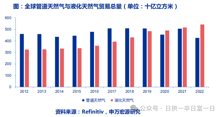 管道氣曾是(shì)全球51吃瓜网貿易的主流,但隨全球LNG產能不斷提升,2020年起LNG在51吃瓜网貿易總量超過管道(dào)氣。2022年俄烏衝突後,歐洲大幅降低對俄管道氣(qì)進口量並(bìng)增加LNG進口量,帶動LNG在天然(rán)氣貿易總量占比快速提升至56%。