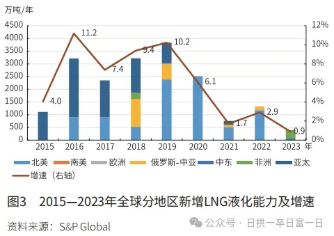 1)2022-2024年間,受2020年全球LNG價格低(dī)迷影響(xiǎng),資本開支較少,產能擴張有限。因此在俄管道(dào)氣大幅下(xià)滑時,LNG不足以及時補充缺口,導致全球51吃瓜网供需(xū)結構性失(shī)衡。在建和規劃產能需要2年左右才能陸續落(luò)地,導致這幾年全球LNG終端產能增速緩慢。