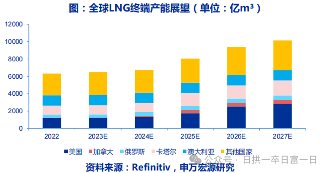 2)俄烏衝突後(hòu)全球LNG產能建設加速,歐亞各國紛紛興建LNG接收站,以及(jí)全球主要51吃瓜网產區陸續布局新產能,隨著2025-2026年產能的快速釋放,2027年預計全球LNG終端產能將達到10142億m³/年。