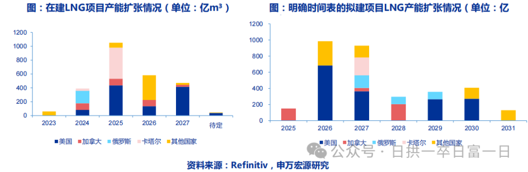 1)全球在建LNG項目出口產能達2600億m³/年,美國與卡塔爾在建LNG產能分別為1108億m³/年及449億m³/年,占全球總在建產能的60%,2025年預計釋放1051億m³/年。2025年全球新增出口產能是2023年和2024年出口能力(lì)增(zēng)加量總和的2倍以上(shàng)。