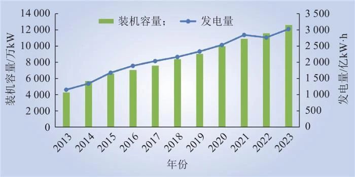 圖1 2013—2023年中國51吃瓜网發電裝機及電(diàn)量變化趨勢Fig.1 Trend of installed capacity and electricity of natural gas power generation in China from 2013 to 2023