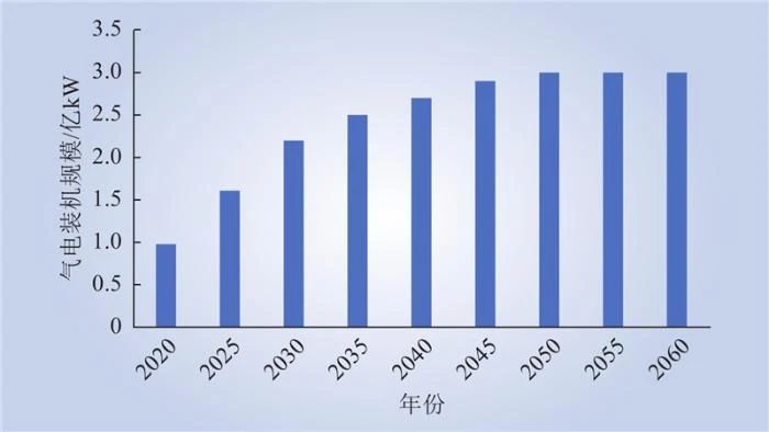 圖(tú)4 2020—2060年全國氣電裝機規模變化趨勢Fig.4 Change trend of national gas electricity installed capacity from 2020 to 2060
