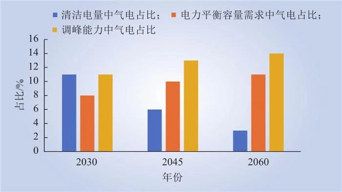 從調節(jiē)支撐看,氣電是“調峰促(cù)消納”的有效電源,對調峰能力的貢獻作用在遠期占主導。隨著新能源發電滲透率上(shàng)升,電力係統調峰平衡壓力(lì)逐步增大,需要配置含氣電(diàn)在內的更多的靈活性調節資(zī)源(yuán)。根據調(diào)峰(fēng)平衡估算,在(zài)充分考慮煤電靈活性改造、抽蓄、電化學儲(chǔ)能等調節資源的基(jī)礎上,2030年、2060年氣電對調峰供應的貢獻度約為(wéi)11%、14%。