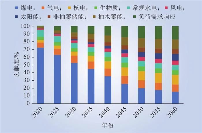圖6 2020—2060年全國(guó)各類電源電(diàn)力平衡貢獻圖Fig.6 Contribution of power balance of various power sources from 2020 to 2060