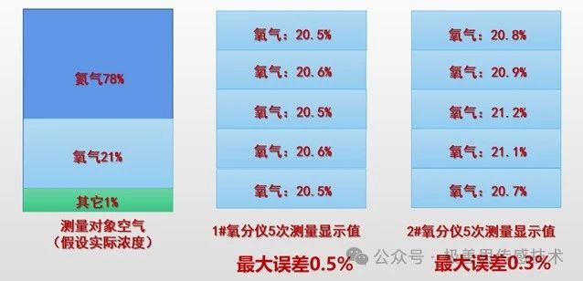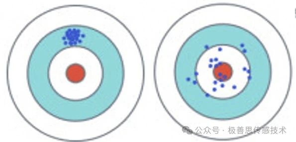 舉個例子,我們測量大氣中的氧氣,假設氧氣含(hán)量為21%,有兩台養分儀,連續5次(cì)測量,儀器顯示值(zhí)如圖1所示。1#最大誤差-0.5%2號最大(dà)誤差0.3%,這兩台表,你認為哪一台更好?就像圖2兩個選手打靶(bǎ),你覺得哪個水平(píng)高(gāo)?