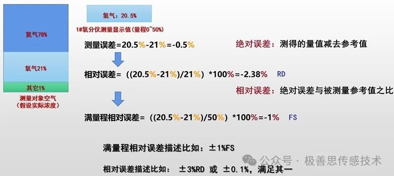 當我們理解了用什麽參數去評估精度(dù)後,我們還需(xū)要知道如何去描述這個指(zhǐ)標。我們測量大氣中的氧氣,如圖所示假如一台儀器量程是0~50%,假如真(zhēn)值是21%,顯示值為20.5%,他的測量(liàng)誤差就(jiù)是-0.5%,這個測量誤差我們(men)也叫做絕對誤差。