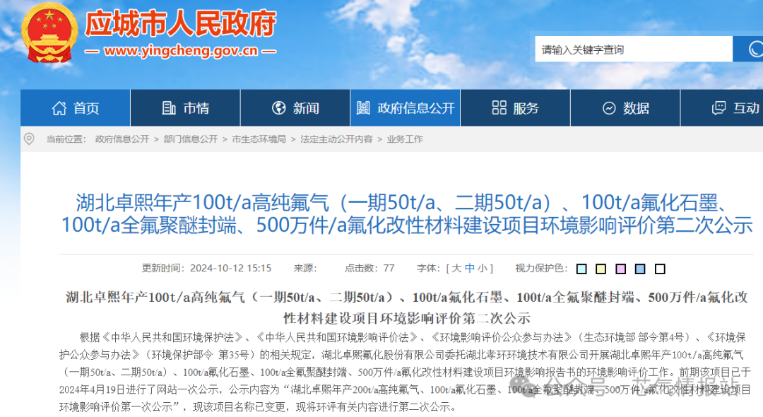 2024年10月12日,湖北卓熙年(nián)產100t/a高純氟氣(一期50t/a、二期50t/a)、100t/a氟化石墨、100t/a全氟聚醚封端、500萬件/a氟化改性材(cái)料建設項(xiàng)目環境影響評價(jià)第二次公示。