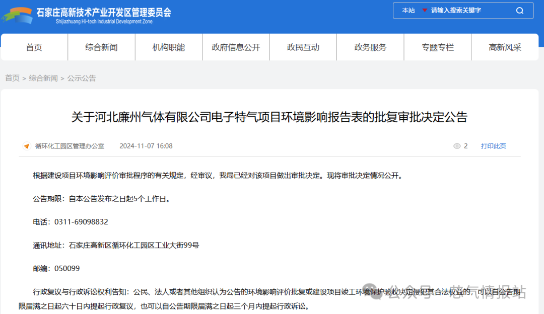 11月7日,河北廉州氣體有限公司電子特氣項目環境(jìng)影響報告表獲批。