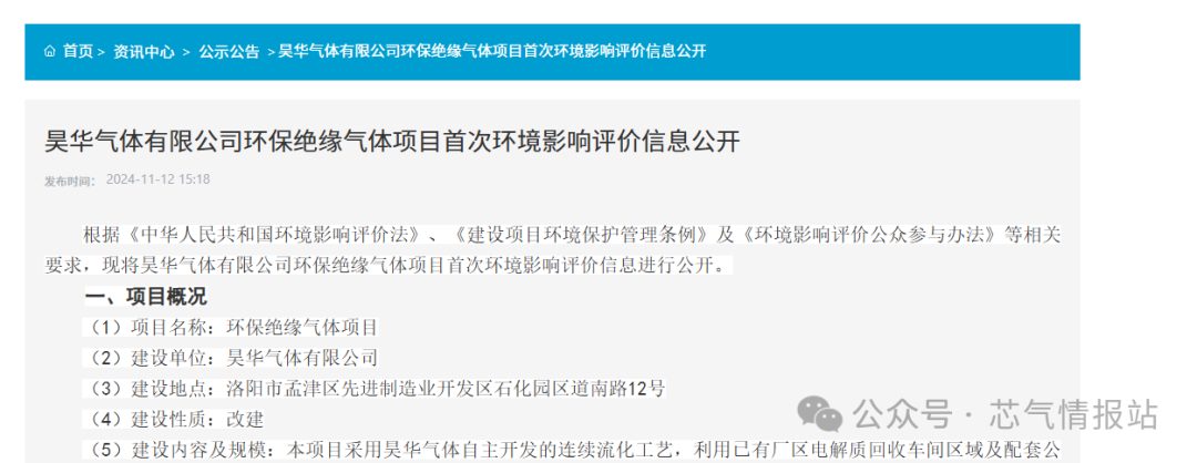 11月12日,昊華科技(jì)官網對(duì)其環保絕緣氣(qì)體項目首次環境影響(xiǎng)評價信息進行公開。