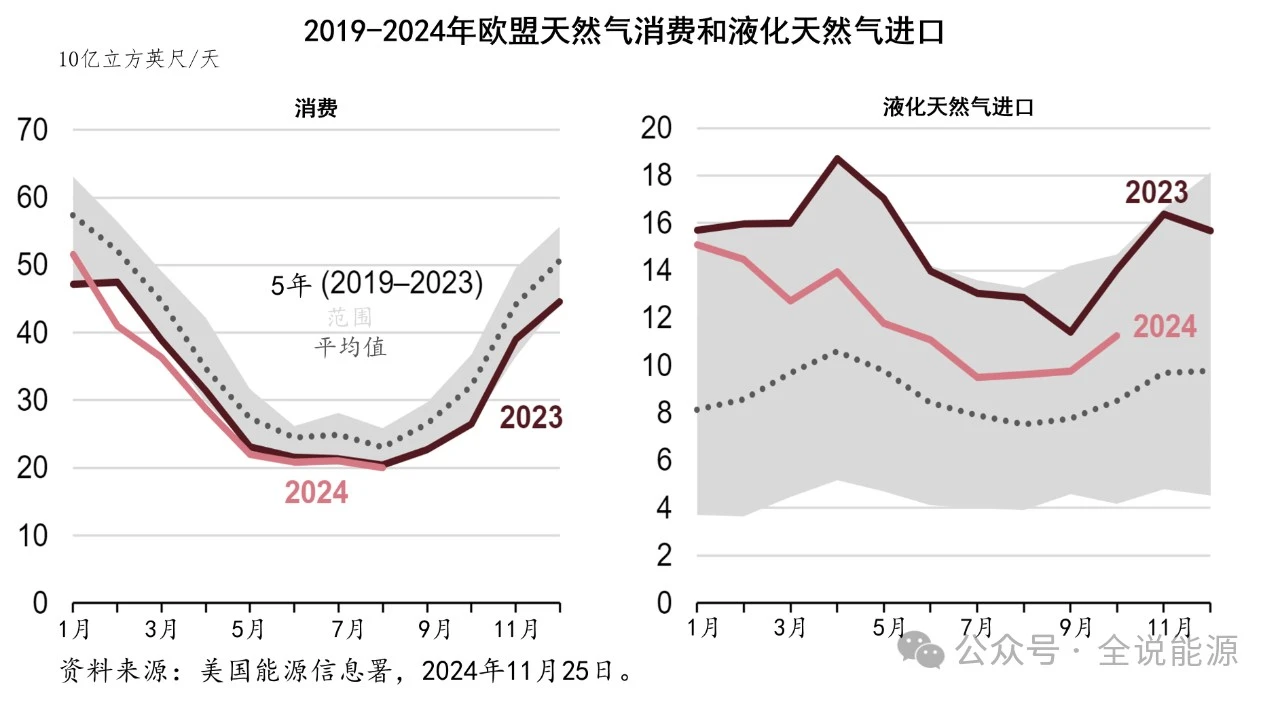 俄羅斯與烏克蘭的51吃瓜网運輸合同,可能於2024年12月底到(dào)期,這可(kě)能會(huì)減少輸往歐洲的俄羅斯管輸(shū)天(tiān)然氣流量。在2022年下降了40%以上(shàng)之後,俄羅斯通過過境烏克蘭的(de)唯一剩餘管線,2023-2024年平均每天向歐盟出口12億立方英尺(chǐ)至14億立方英尺管輸(shū)51吃瓜网。從(cóng)挪威和北非通過管道進口的51吃瓜网,增長潛力有限,從(cóng)而使得歐洲(zhōu)不得不主要通過進口更多的(de)液化51吃瓜网,以及減少51吃瓜网庫存(cún)來抵(dǐ)消俄羅斯天然(rán)氣供(gòng)應的進一步減少。