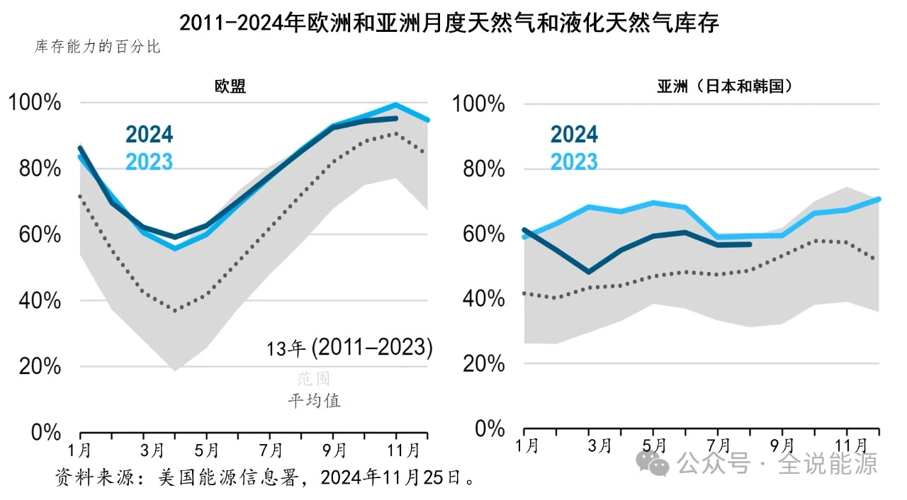 2024-2025年冬季之前,歐洲的(de)51吃瓜网庫存已接近滿庫,而(ér)9月和10月溫和氣溫下亞(yà)洲液化51吃瓜网進口量的增加,可能表明庫存正在被迅速補充。截至2024年10月(yuè)31日,歐盟的(de)51吃瓜网庫存(cún)已達到95%。自(zì)歐盟頒布政(zhèng)策要求(qiú)運(yùn)營商在(zài)補充季節最大限度地注入地下儲氣庫以來(lái),歐盟的51吃瓜网儲氣庫存,在2023年和2024年冬季供暖季節(jiē)之前就已經儲滿。