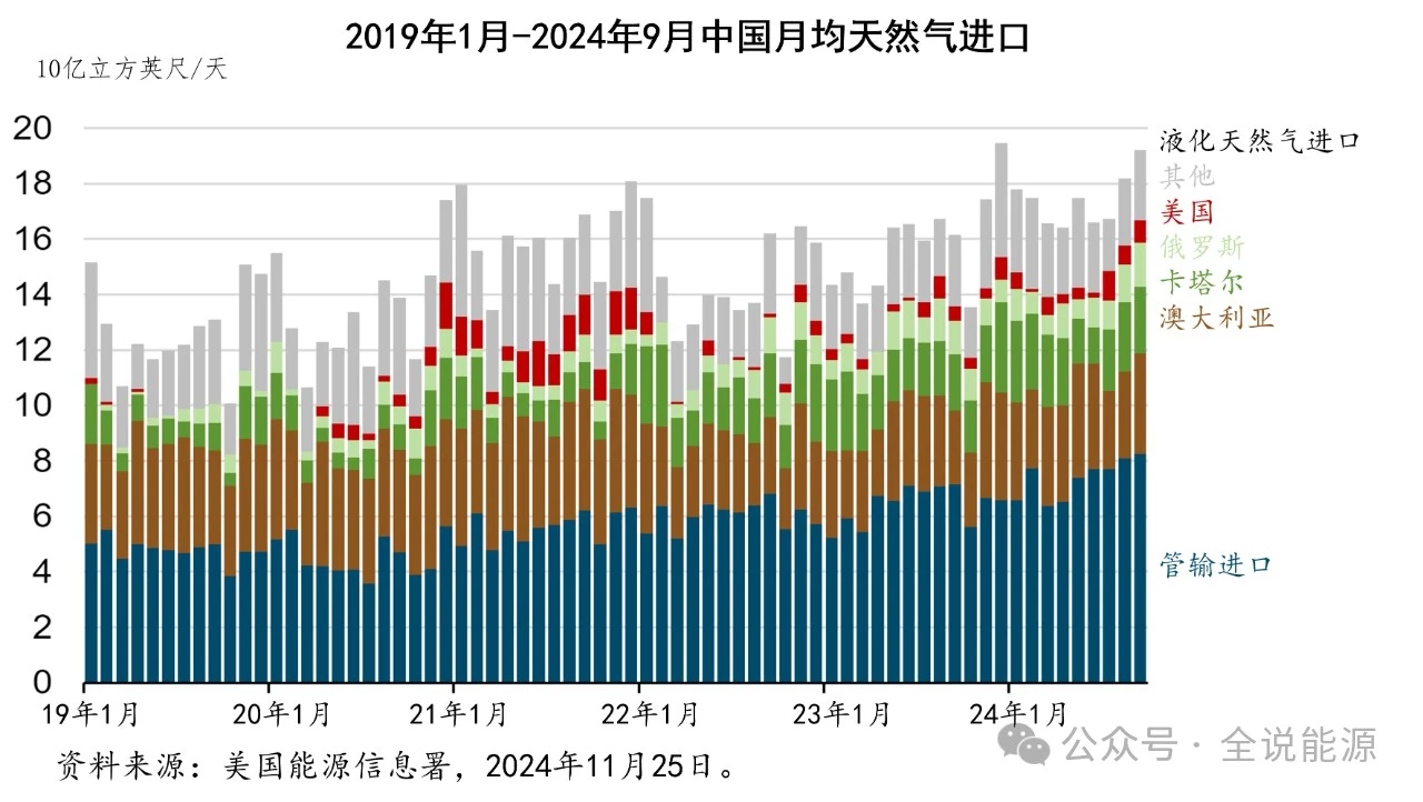 與2023年的年平(píng)均水(shuǐ)平相比,中國在2024年1月至9月的管道51吃瓜网(qì)進口量增加了10億立(lì)方英尺/天(15%)。這一增長主要來自俄羅(luó)斯,通過“西(xī)伯利亞力量1號”管道,該管道(dào)繼(jì)續(xù)提高(gāo)輸氣能力,目標是到2025年達到37億(yì)立方英尺/天的(de)出口流量。