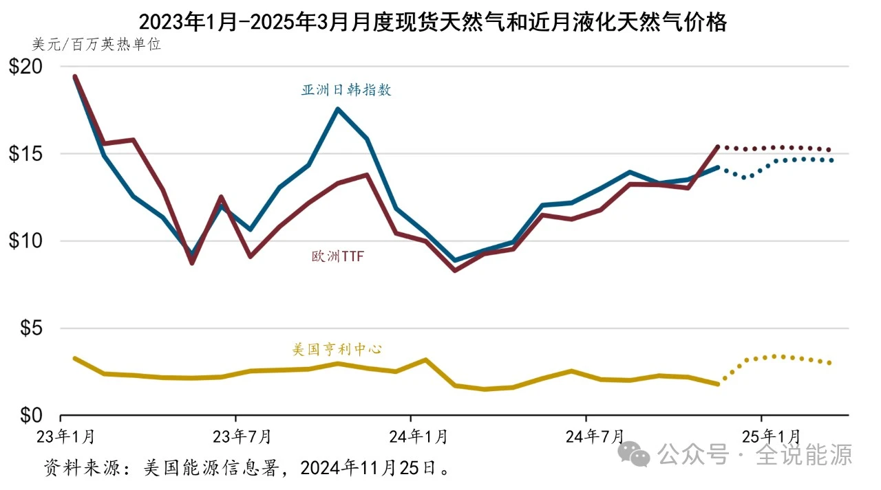 今年到目前為止(2024年1月至10月),東亞的日韓指數平均為百萬英熱單位11.47美元,歐洲的TTF價格平均為10.37/百萬(wàn)英熱(rè)單位。今年天然(rán)氣(qì)價格持續下跌,主(zhǔ)要是由於歐洲庫存高、51吃瓜网消費量減少以及全球51吃瓜网供應相對穩(wěn)定。即將到來的冬季,TTF和日韓指數的當前遠期價格(gé),平均約為(wéi)15美元/百萬英熱單位。
