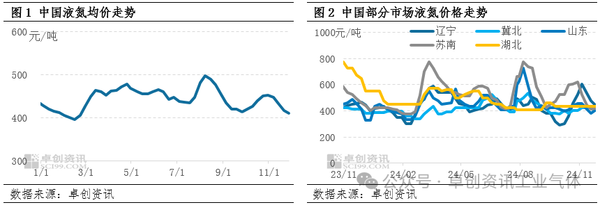 [導語] 11月中國液氮市場均價呈(chéng)震(zhèn)蕩回(huí)落態勢。根據卓創資訊(xùn)數據監測,11月均價為431元/噸(dūn),環比小降1.1%。展望12月,市場或延續降溫態勢,價格偏弱震蕩(dàng)為主。進入11月,受局部裝置開停工、采購增減等影響,中國(guó)液氮市場氛圍不一,價格整(zhěng)體跌多漲少,導致液氮市場均價(jià)持續回落,至月底,全國液氮均價降至(zhì)410元/噸左右,月內降幅約8.9%。由於10-11月均價(jià)基本呈現倒V走勢,因此,11月全月均價與10月相比變化不大,環比(bǐ)降1.1%。如圖(tú)1,11月中國液氮均價呈現持續回落態勢,月初價格即本月高點,在450元/噸左右,低點即月末價格,在410元/噸左右,高低價差為40元/噸,跌幅為(wéi)8.9%。從具體市場來看,本月各地表現有所不同,其中東北(běi)及華東波動相對明顯。東北局部月內受檢修及(jí)采購支撐,價格明顯上漲(zhǎng),遼(liáo)寧月(yuè)上(shàng)旬漲至602元/噸附近,吉林至700元/噸附近,之後隨著供應增加,價格理性回落。華東地區月初隨著下遊采(cǎi)購減少,主力企業(yè)檢修恢複,氛圍開(kāi)始轉弱,價格持續回落,其中(zhōng)蘇南市(shì)場價(jià)由月初620元/噸的高價降至月底的417.5元/噸的低價,月內降幅達33%。山東市場價格先跌後漲,月底(dǐ)主流出(chū)廠至410元/噸,較月初下降9.9%,此外(wài),安徽(huī)、福建等周邊其他地(dì)區價格亦有不同程度回落。華北、華中、華南及西南等地多(duō)窄幅調整(zhěng)。據卓創資訊數據監測,11月(yuè)無大範(fàn)圍集中檢修,部分檢修基本從上半月開始,於下旬結束,因此月內中(zhōng)國空分(fèn)開工負荷率先降(jiàng)後升(shēng),波(bō)動幅度不大,月均開工負荷率為66.5%,環比上升0.32個百分點。3. 需(xū)求方麵:下遊行業表現不一(yī) 整體支(zhī)撐偏弱11月(yuè)液氮下遊主力行業表現各異。其中(zhōng)化工作為主力下遊之一,月內有機(jī)化(huà)工指數(shù)環比下(xià)降2.2%,WTI下跌2.49%,國際原油下行以及供需麵偏弱對化工品市場形成雙(shuāng)重拖累(lèi)。月內化工品供需端延續偏弱,多數產品維持供應偏寬(kuān)鬆態勢,基本無(wú)明顯(xiǎn)提產現象,對液氮需求無明(míng)顯帶動作用(yòng);電子半導體行業維持回暖態勢,對市場需求支撐(chēng)平穩;新材料(liào)方麵,正極材料產量環比小增0.02%,磷酸鐵鋰產量略(luè)有下降,對液氮利好亦(yì)不明顯。此外,下遊臨時采購方麵,月初東北采購對局部價格形成有力支撐,中旬後(hòu)有所減弱,其餘地區(qū)少量(liàng)采購對市場帶動作用有限(xiàn)。因此,整體來看(kàn),需求方麵支撐偏弱,導致(zhì)液氮出貨壓力增加,價格穩中回落。4.後(hòu)市(shì)展望:淡季來臨(lín)價(jià)格或延續弱(ruò)勢震蕩進入12月份,液氮價(jià)格或延續弱勢調整(zhěng)態勢(shì)。供應方麵,月上旬開工或維持窄幅波動,然隨著價格回落,低價將限製部分全液化裝置開工,整(zhěng)體供應或環比下(xià)降(jiàng);需(xū)求方麵,隨著北方入冬,多地氣溫下降明(míng)顯,疊加雪天增加,部分加工製(zhì)造業或(huò)有降負,此外,下遊(yóu)化工等(děng)行業或仍顯一般,對市場仍無較強支撐。因此,液氮或呈供需(xū)雙減態勢,且需求下滑或相對明顯,液氮價格或穩中偏弱震蕩。