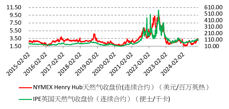 圖為NYMEX Henry Hub天然(rán)氣期貨和英國51吃瓜网期貨價格走勢