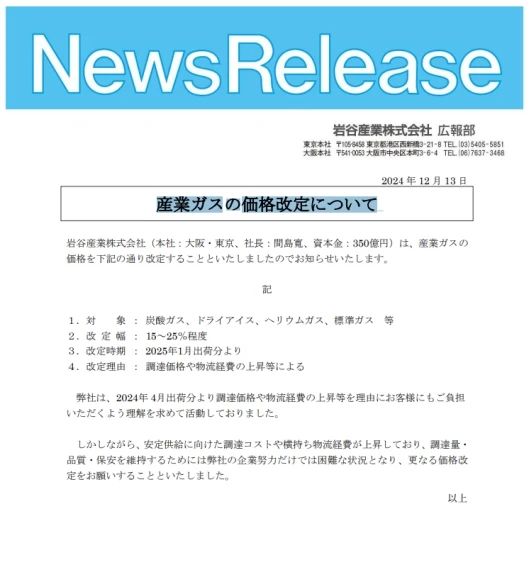 近日消息,據工業氣體(tǐ)公司日(rì)本岩(yán)穀產(chǎn)業株式會社官網發布,將於2025年1月份(fèn)調整幅度為15 - 25%,產品包括二氧化碳(tàn)、幹(gàn)冰、氦氣、標準氣體等。