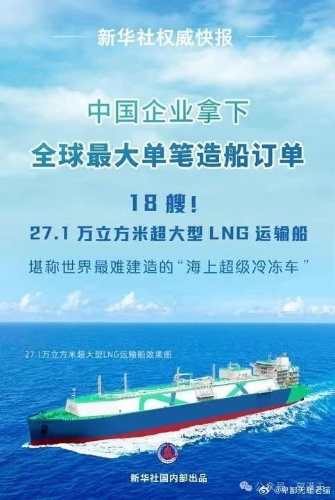 2024年4月29日,中國船舶集團再度中(zhōng)標卡塔爾能源公司(sī)18艘全球最大(dà)27.1萬立方米超大型液(yè)化天(tiān)然氣(LNG)運(yùn)輸船項目(mù),據估算該訂單總金額超過400億(yì)元,創下(xià)全球最大(dà)單(dān)筆造船訂單的紀錄。