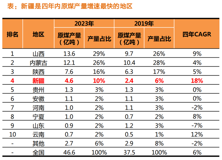 新疆煤炭資源總量約(yuē)2.19萬億噸,占(zhàn)全國煤炭(tàn)資源總量的40.6%,資源量位居全國第一。雖然新(xīn)疆的原煤產量(liàng)在2019-2023年四年間的CAGR18%,遠高於全國CAGR6%,煤炭開采加速發展,但2023年產量僅占全國的10%,仍有較大提升空間。坐擁優質煤炭資源,新疆(jiāng)煤化工產業得到快速發展,尤其是國家提出三基地一通道建設,明確定位新疆建設國家大型煤炭煤(méi)電(diàn)煤化工基地後,煤化工項目投資力度加(jiā)大。