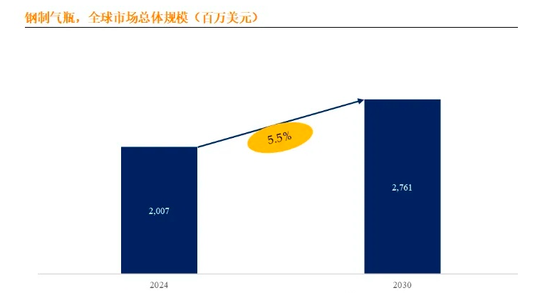 據QYResearch調(diào)研團(tuán)隊最新報告“全球鋼製氣瓶市場報(bào)告2024-2030”顯示,預(yù)計2030年全(quán)球鋼製氣瓶市場規模將達到27.6億美元,未來幾年年複合增長率CAGR為5.5%。