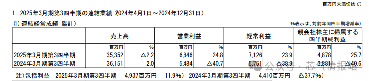該公司維持此前對2025年3月止全年財年綜合業績的預測。銷售額(é)預計增長(zhǎng)3%至500億日元(約合人民幣23.72元(yuán)),淨利潤預計增長23%至70億日元(約(yuē)合人民幣(bì)3.32億元)。