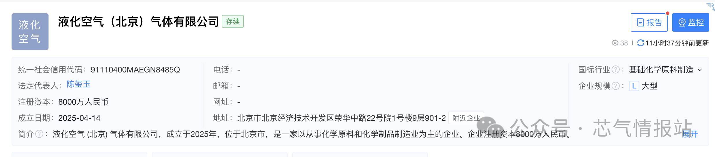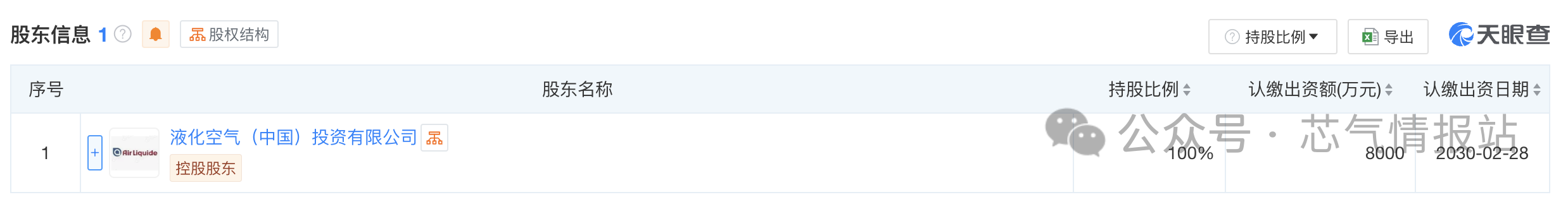 4月14日,液化空氣(北京)氣體有限公司(sī)成立,法定代表人為陳璽玉,注冊資本(běn)8000萬人民幣,經營(yíng)範圍包括基礎化學原料製造、貨(huò)物進出口(kǒu)、技(jì)術進出口、化工(gōng)產品銷售等。股東信息顯示,該公司由液化空(kōng)氣(中國)投資有限公司全資持股。液(yè)化空氣集團(tuán)(Air Liquide),成立於1902年,是世界上最大的工業氣體和醫療氣體供應商之(zhī)一。液化空氣集團自(zì)1916年進入中國市場(chǎng),目前在中國設有近90家工廠,遍布40多個城市,擁有約4000名員工。其主要業務集中在工業與醫(yī)療保健領域氣體(tǐ)、技術(shù)和服務。