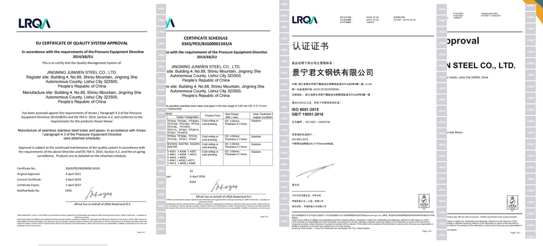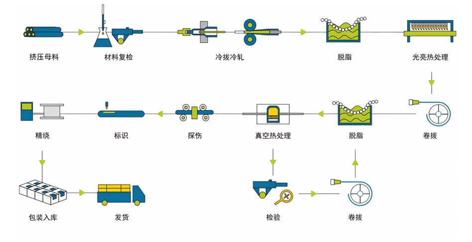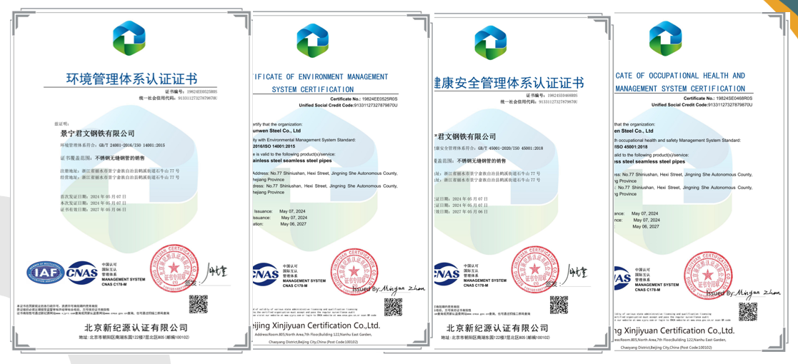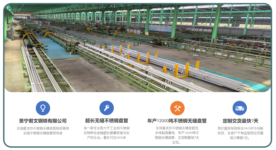 景寧君文鋼鐵有限公司是一家專業致力於(yú)不鏽鋼及特種合金鋼超長盤管研發與生產的企業。生產廠房麵積3萬多(duō)平方,員工220餘人,總(zǒng)投資1.5億元,建有4條世界先(xiān)進水平的不鏽鋼超長無縫盤(pán)管(guǎn)專用生產(chǎn)流水線。生產工藝采用:熱擠壓/穿孔+冷軋+冷拔+光亮真(zhēn)空固溶熱處理。