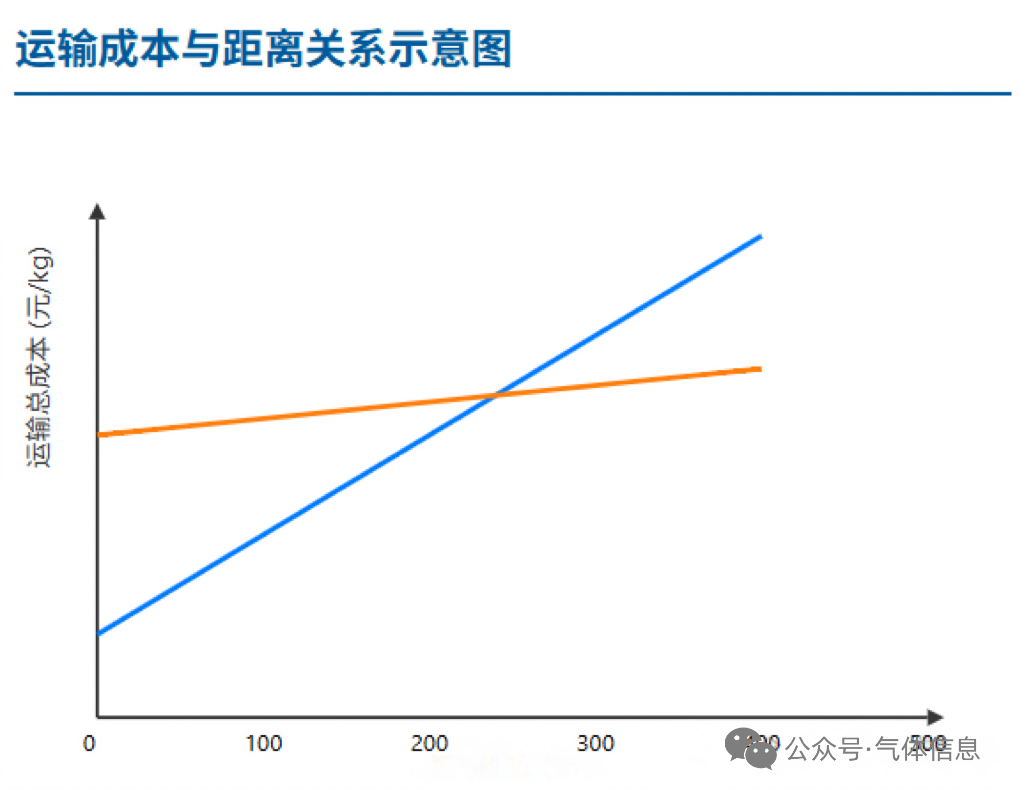 其中,藍色代表高壓氣氫的運輸成本線;橙色為液氫運輸成本(běn)線。