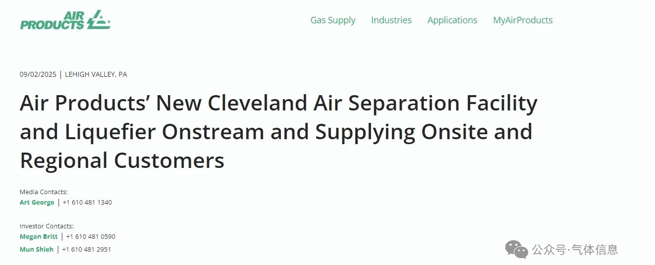 2025年9月2日,空氣產品公司(Air Products)宣布其位於美國俄(é)亥俄州克利夫(fū)蘭的新建空氣(qì)分離設施(ASU)已成功投產並投入運營(yíng)。該設施由公(gōng)司自主投資、建造及(jí)運營,具備液態氣體生產能力(lì)。