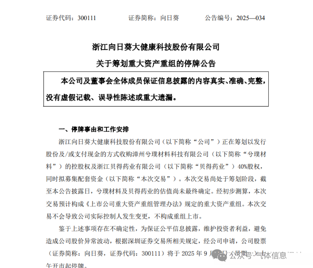 9月7日晚,藥企向日葵發布關於籌劃重(chóng)大資產重(chóng)組的停牌公告,擬跨界收購一家半導(dǎo)體電子特氣企業。