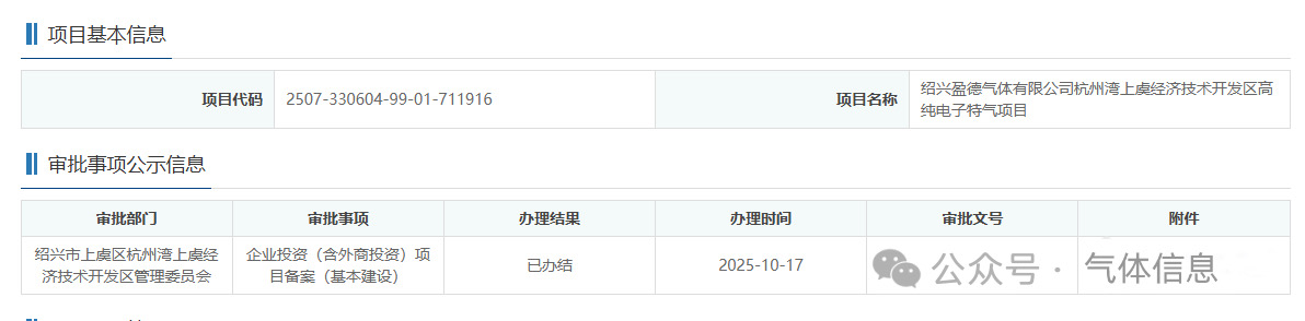 10月17日,紹興盈德氣體有限公司(sī)杭州灣上虞經濟技術開發區高純電子特氣項目獲備案。