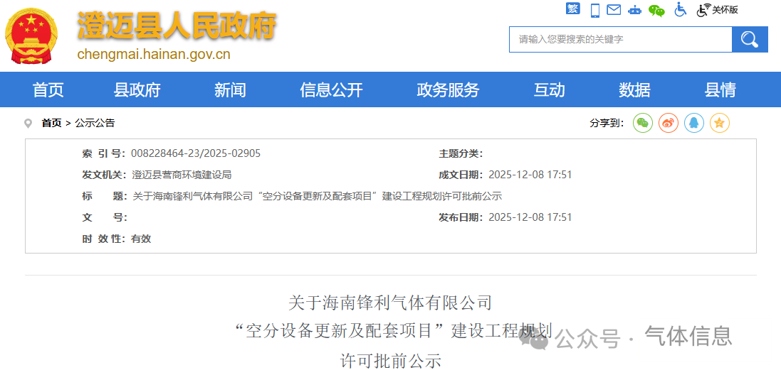12月8日,澄邁縣政府官網發布關於海南鋒利氣體(tǐ)有限公司“空分設備更(gèng)新及配套項目”建設工程規劃許(xǔ)可批(pī)前公示。