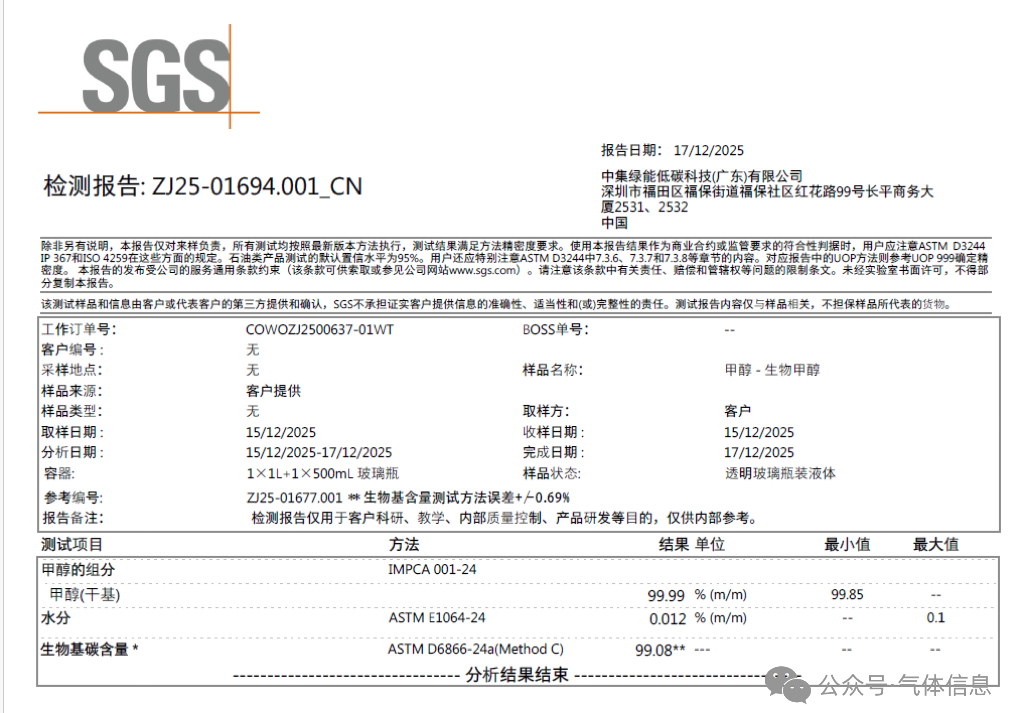 中集安瑞科此次交付的生物基(jī)甲醇產品通過美國Beta實驗室的放射性同位素碳C14檢測(cè),生物基碳(tàn)含量達99.08%,源自(zì)廣東湛江5萬噸/年的生物(wù)甲醇工廠。湛江項目成功突破生物質氣化和合成氣淨化技術瓶頸,產出純度(dù)達99.9%的高品質產(chǎn)品,全生命周期碳排放顯著(zhe)低於傳統化石甲(jiǎ)醇,助力(lì)生物醫藥產業(yè)的綠色升級。
