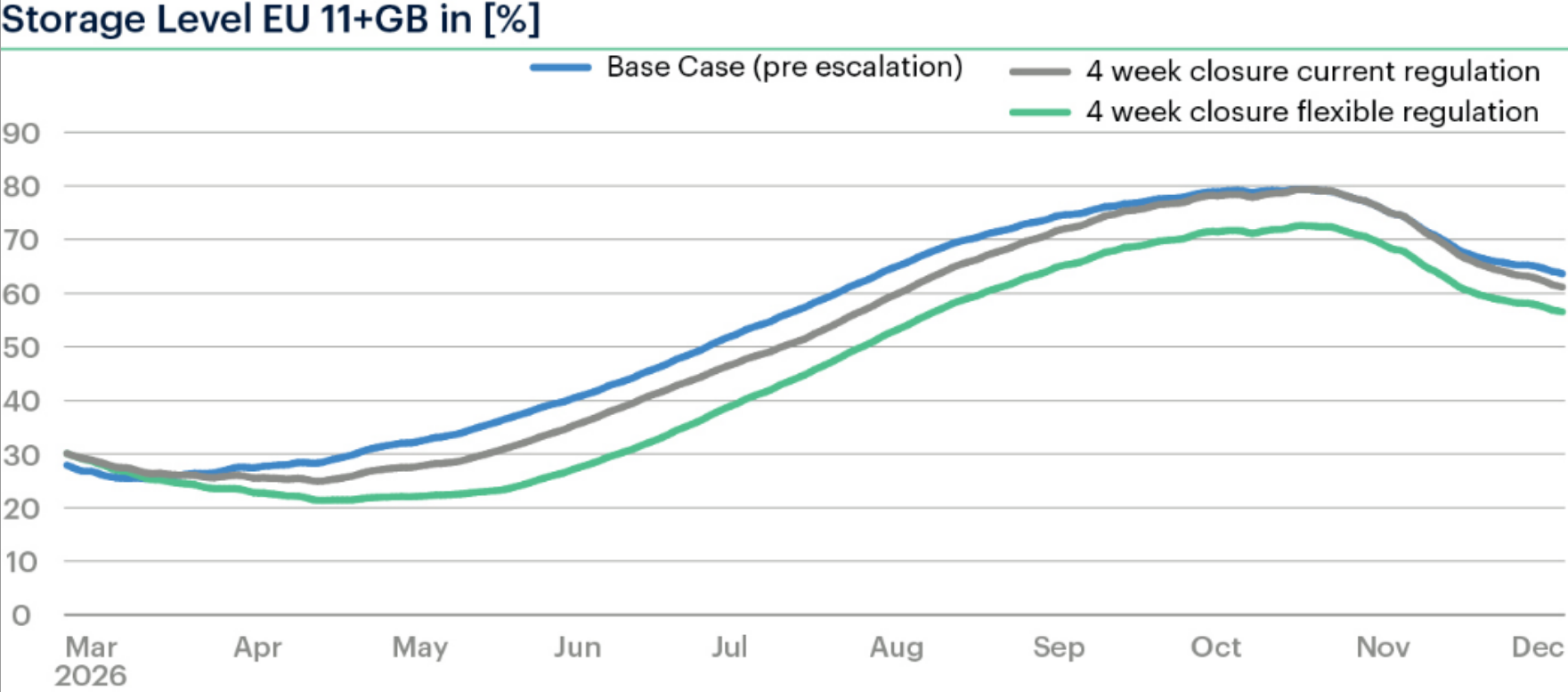 放寬儲氣規則雖可緩解短期價格峰值,但代價(jià)是削弱對下一冬季的戰略緩衝能力。模型顯示,在放鬆監管(guǎn)後,西歐與中歐冬末儲氣(qì)水平(píng)可能降至約230TWh(庫容率約21%),比情景1低近40TWh,較衝突前基線低約45TWh。這意味著短期靈活性換來的是更高的冬季供應短缺風險。
