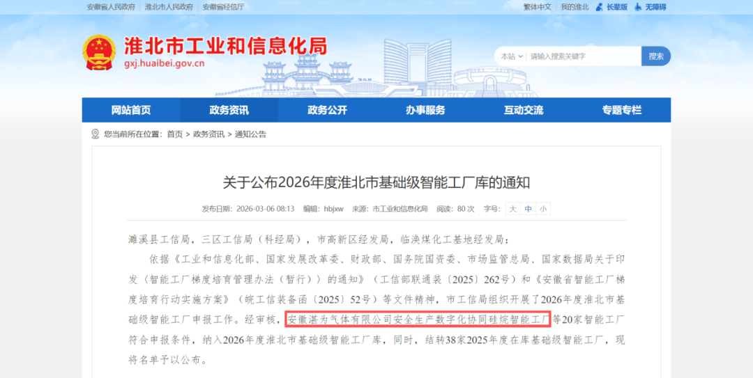 近(jìn)日,淮北市工業和信息化(huà)局公布了2026年度智能工廠名單,華中氣體全資子公司—安徽湛為(wéi)氣(qì)體有限(xiàn)公司申報的“安全(quán)生產數字化協同矽烷(wán)智能工廠”,納入2026年度淮(huái)北市智能工廠庫。