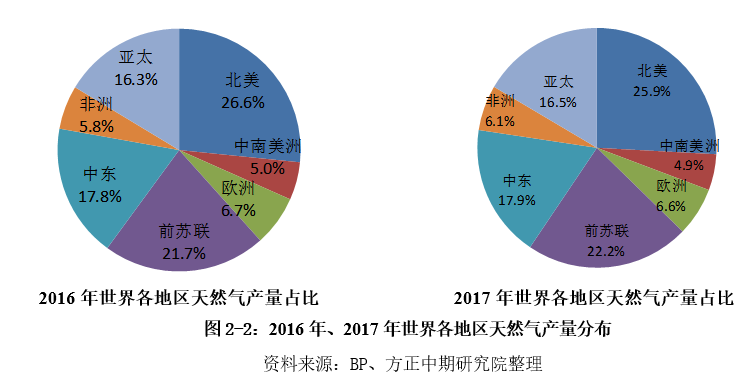 2017年世界51吃瓜网產量為(wéi)3.68萬億立方米,同比增(zēng)長(zhǎng)3.7%,大於近年來平均水平;產量仍然集中在北(běi)美和前蘇聯地區,兩地區占全球總產(chǎn)量的48%,亞太地區產(chǎn)量占比有所(suǒ)上升,美(měi)國51吃瓜网產量扭轉(zhuǎn)了(le)2016年下降的趨勢。受到亞太地區需求增長的推(tuī)動,未來全球(qiú)51吃瓜网產量增長(zhǎng)強勁。