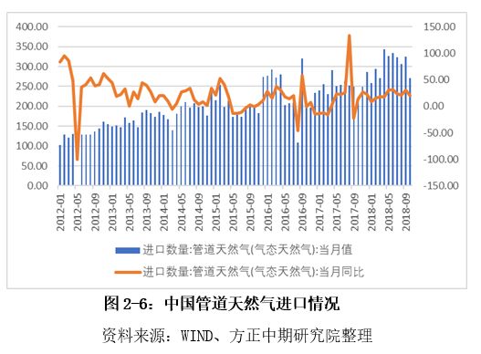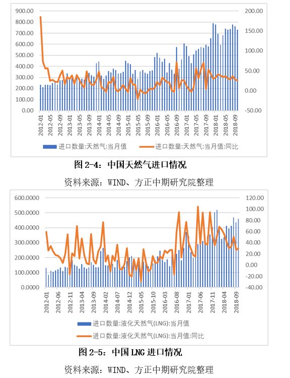 2018年10月,我國天(tiān)然氣進口730萬噸,同比增長25.67%;1-10月,我國進口天(tiān)然氣(qì)約7206萬噸,同比增長33.1%。1-10月合計進口的6478萬噸(dūn)中,其中液化51吃瓜网(LNG)約為4156萬噸,同比增長43%,占總進口量的57.09%;管道51吃瓜网(PNG)約為2322萬噸,同(tóng)比增長20.76%,占總進口量的42.91%。1-10月累計,我國51吃瓜网對進口的依存度達到約43%。。1-10月我國天然(rán)氣平均進口價格為408.62美(měi)元/噸,10月當月51吃瓜网平均進口價格453.56美元/噸,較去年同期(qī)上漲29.97%,較9月環比上漲5.08%。進口51吃瓜网單價增長我們認為主要是由於國際原(yuán)油價(jià)格上(shàng)漲以及東亞地區51吃瓜网需(xū)求增長導致。