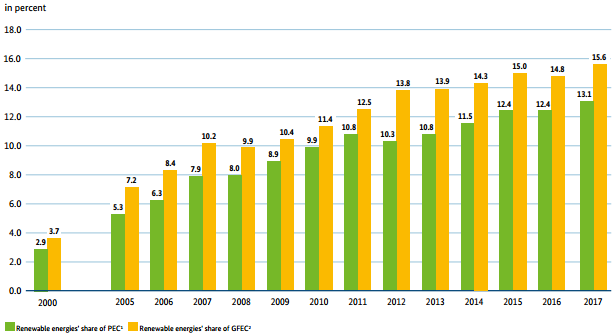 (德國可(kě)再生能(néng)源占比變化趨勢 來源:德國聯邦經濟能源部2017年年度能源(yuán)統計報告)