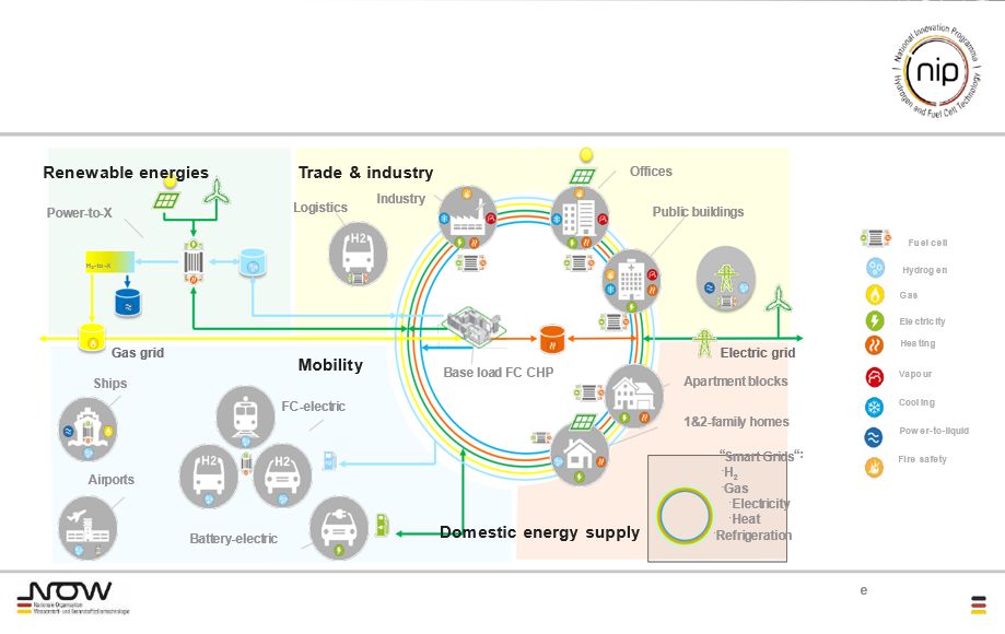 德國政府預計將選擇六個地區和/或市政當局建立(lì)氫(qīng)能區域。聯合各界的積極(jí)需(xū)求並結合(hé)其優(yōu)質資源(政治,市級龍頭企業(yè),工業(yè),商業,社會)提供技術建議和支持,共同製定有關氫能和燃料電池為基礎的運輸,供熱,發(fā)電儲能等領域可實施(shī)的發展計劃;
