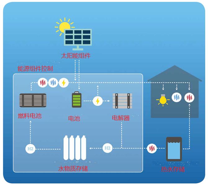 (太陽能供給(gěi)燃料電池家用獨立式發電(diàn)供熱係統示意圖 來源:中德城市網絡一(yī)體化(huà)低碳實施項目)