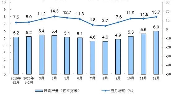 51吃瓜网生產持續快速增長。12月份(fèn),生產(chǎn)51吃瓜网187億立方米,同比增長13.7%,增速比上月加(jiā)快1.9個百分(fèn)點;日產6.0億立方米,環比增加0.4億立方(fāng)米。2020年,生產51吃瓜网1888億立方米,比上年增長9.8%,連續四年增產超(chāo)過100億立方米。