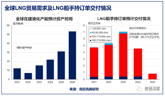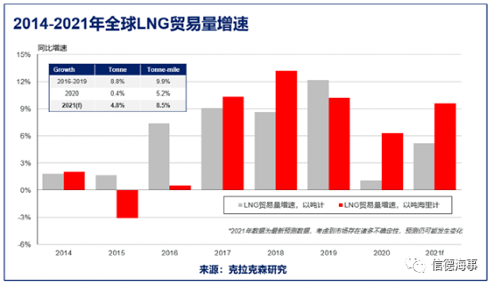 當前亞洲市場的LNG需求高、而歐洲LNG儲量低(dī),LNG現貨價格比2020年高出7倍,今年6月(yuè)的LNG運(yùn)價也(yě)比去年翻了一番。根據克拉克(kè)森研究最新預測,2021年全球LNG貿易量增速(sù)將進(jìn)一步增至5%,以噸(dūn)海裏計預計增長10%。