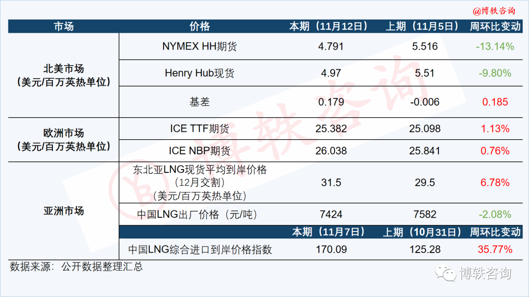 本(běn)周,美國本土產量持續(xù)提升,儲氣庫即將由注氣期轉入采氣期,美元匯率跳升至一年多以來的(de)最高點,加之歐洲氣價震蕩整理(lǐ),NYMEX Henry Hub期(qī)貨價格大幅回落。但天氣預報顯示,未來一周,美國本土(tǔ)大部(bù)地區氣溫將持(chí)續下(xià)降,采暖需求將有所(suǒ)提升,致使價格降幅有所收窄。