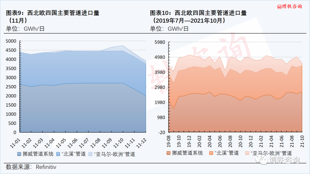 俄氣方麵,“亞馬爾-歐洲”管道氣量有所回升(shēng),本周五(11月12日)的供應量為151GWh/日;“北溪”管道(dào)氣保持穩定,本周五(11月12日)的供應量為1753GWh/日。