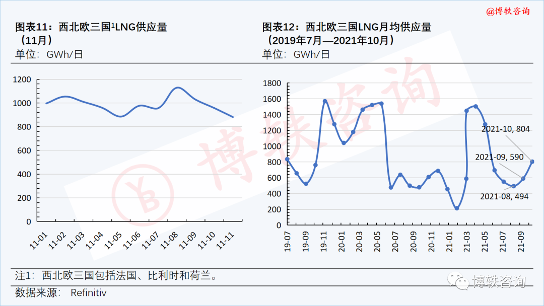 LNG供應量小幅下滑。本周五(11月12日),西北歐三國的LNG供應量為881GWh/日,周環(huán)比(11月5日)下(xià)降4GWh/日。