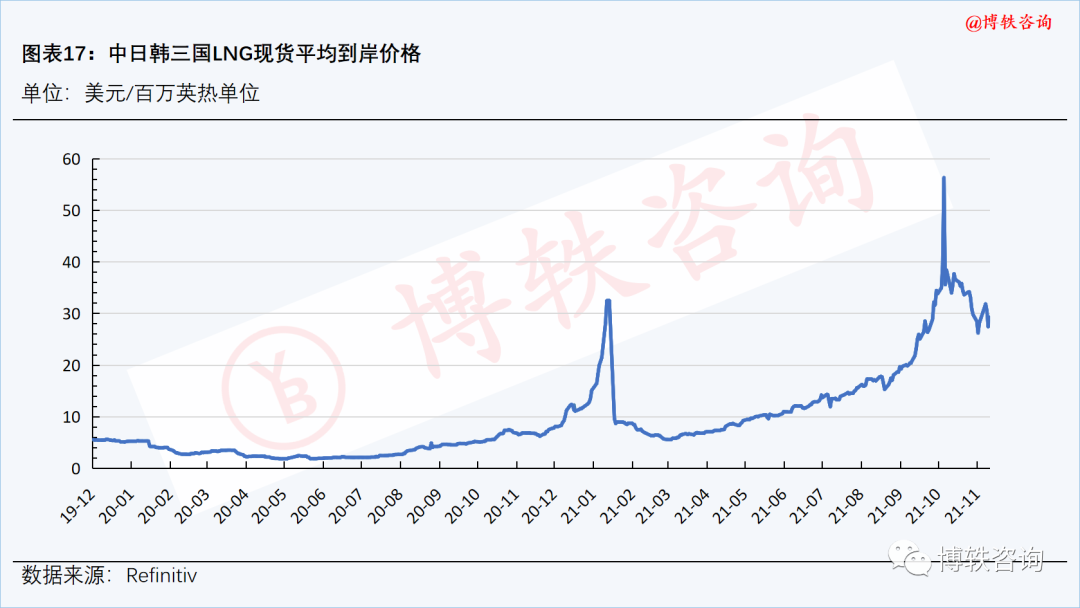 路透(tòu)社提供的信息顯示,本周(11月8日-12日),東(dōng)北亞地區LNG現貨到岸價格(12月交割)為31.5美元/百萬英熱單位,周環比(11月1日-5日)上升2美元/百萬(wàn)英(yīng)熱單位。
