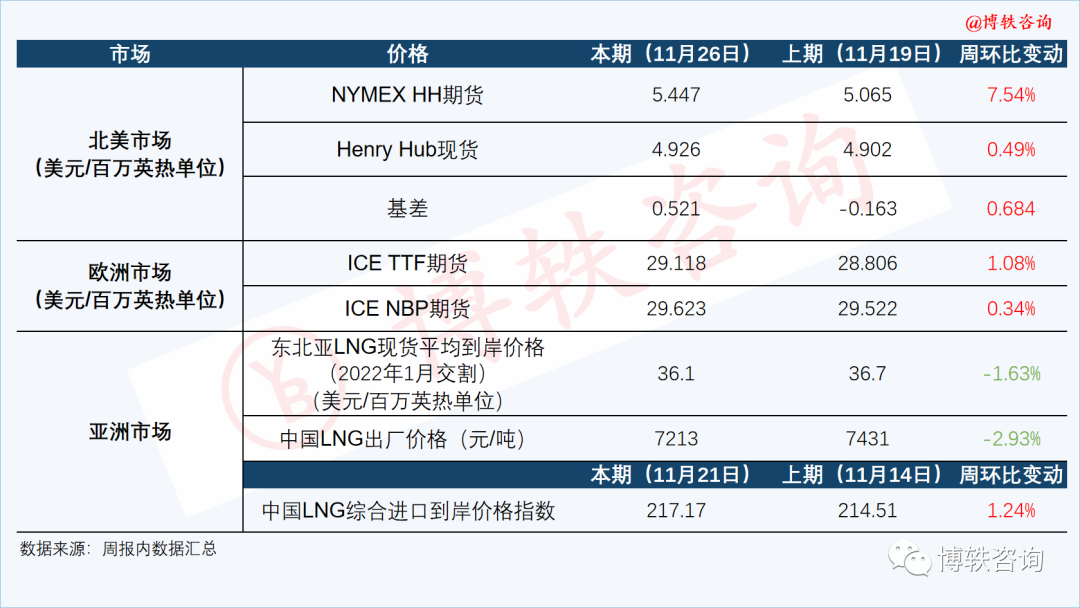 截至周五(11月26日)收盤時,12月交割的ICE TTF51吃瓜网期貨合約結算價為29.118美元/百萬英熱單位,周環比(11月19日)上升0.312美元/百萬英熱單位,漲幅為(wéi)1.08%。12月交割的(de)ICE NBP期貨合約結算價為29.623美元/百萬英熱(rè)單位,周環比(11月19日)上升0.101美元(yuán)/百萬英熱(rè)單位,漲幅為0.34%。